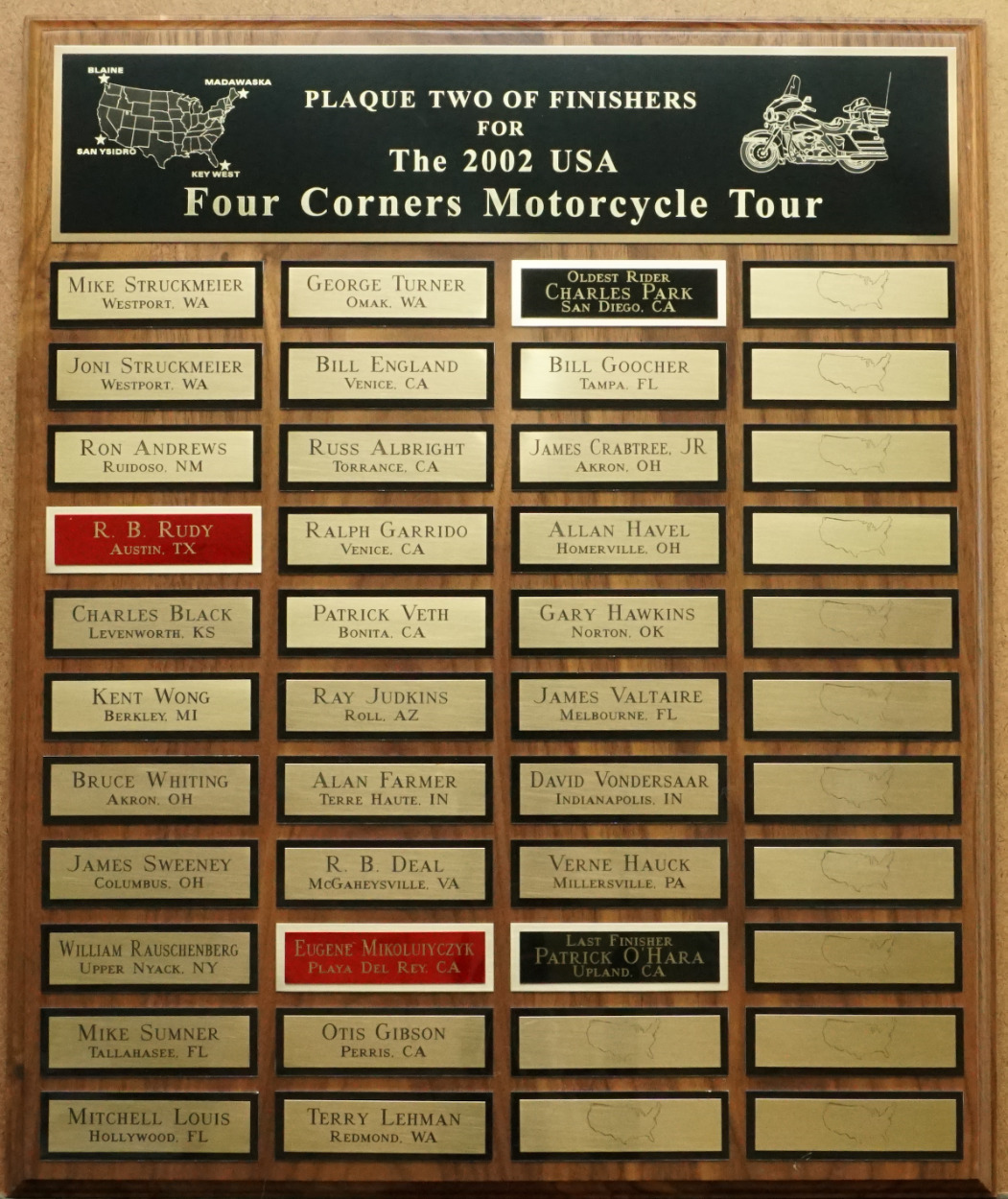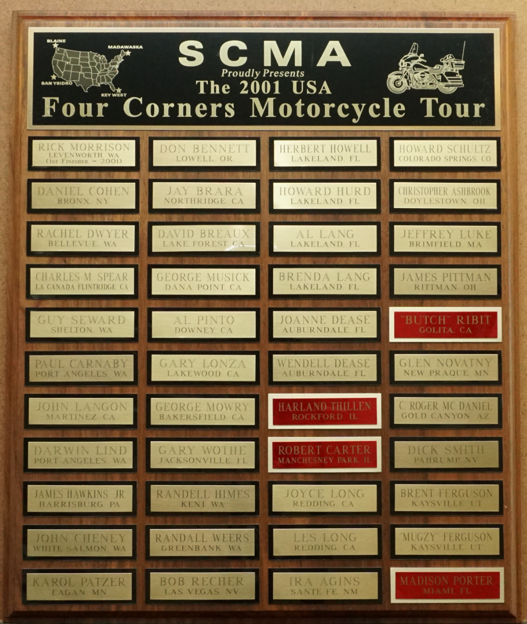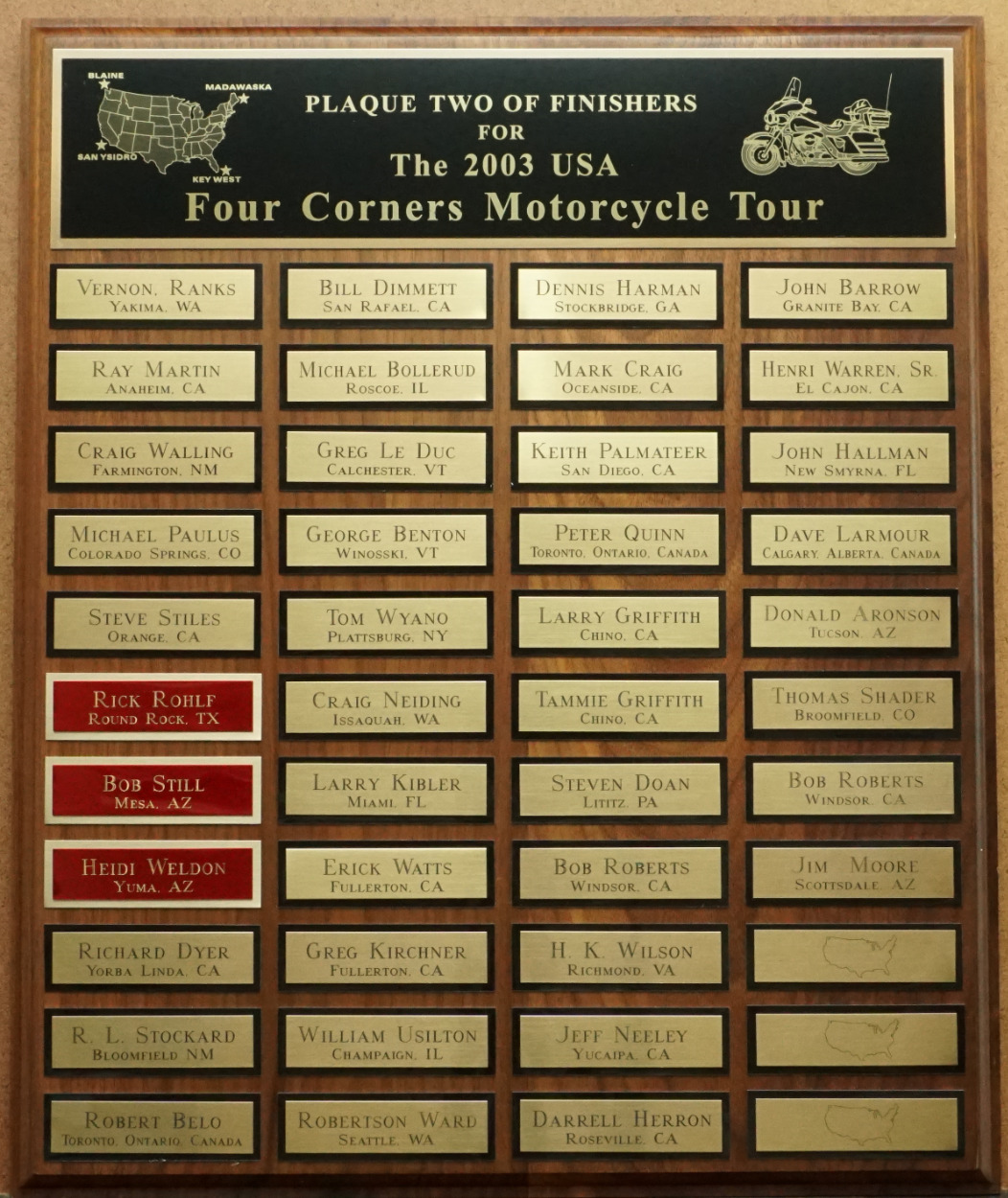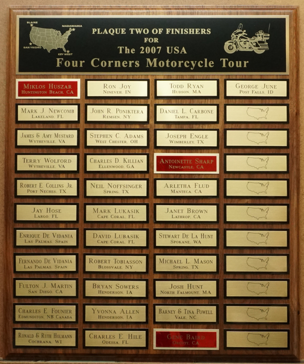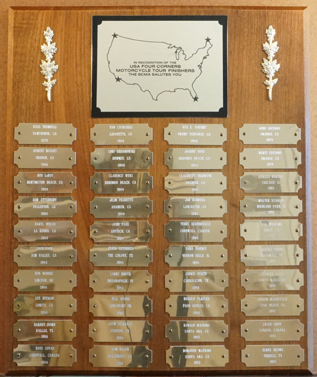 The USA Four Corners ride started officially in 1984. In the early years, the name and home town of each Four Corners Finisher was engraved on metal plates and affixed to these large walnut plaques. These plaques were created for finishers from 1984 with a few before 1984, through 2007. All of the Four Corners finishers from 1984 to the prior year are listed on the Finishers and Awards page. The red plates indicate the rider had finished the Four Corners before. These plaques were brought to and displayed at the annual Four Corners Banquet that became the Finishers Banquet in later years. That is a remarkable feat in later years since each plaque weighs about six pounds. These have been photographed a few different ways to share the look of the flashy and highly reflective surfaces as well as in a darker mode allowing you to read the names. These have been in storage for years, and we are thrilled to be able to share them here.