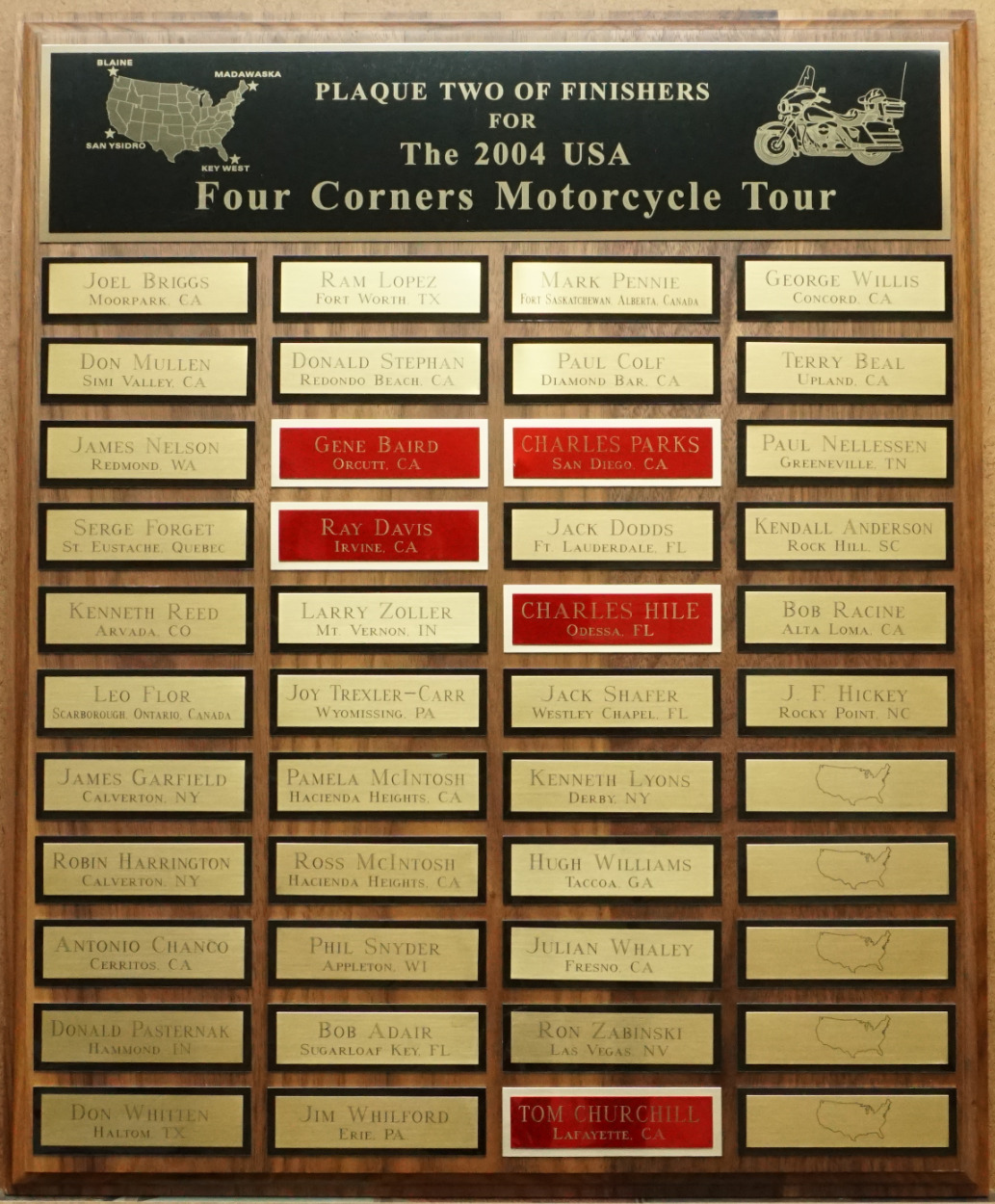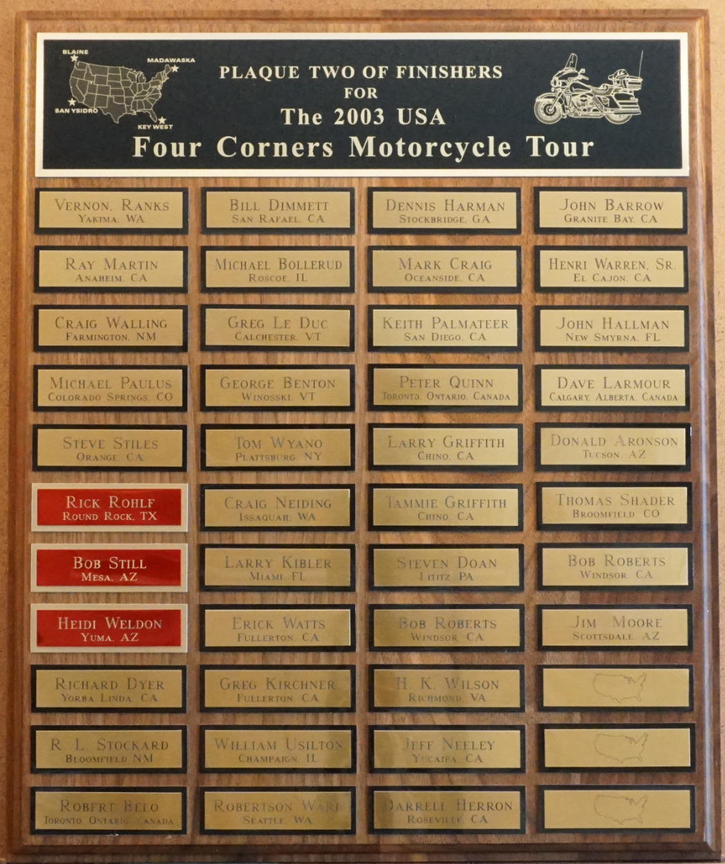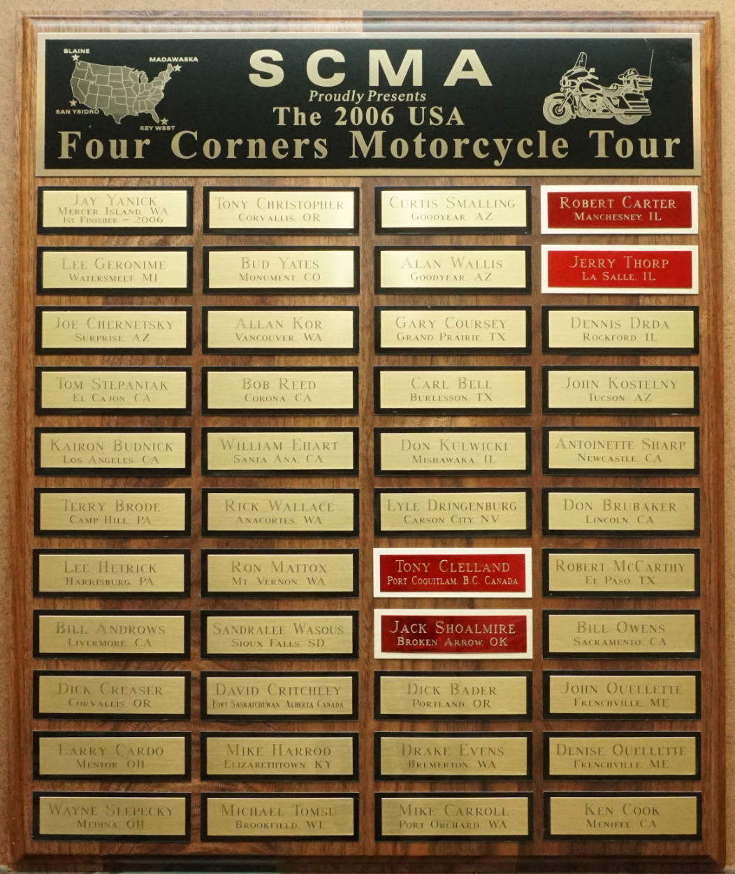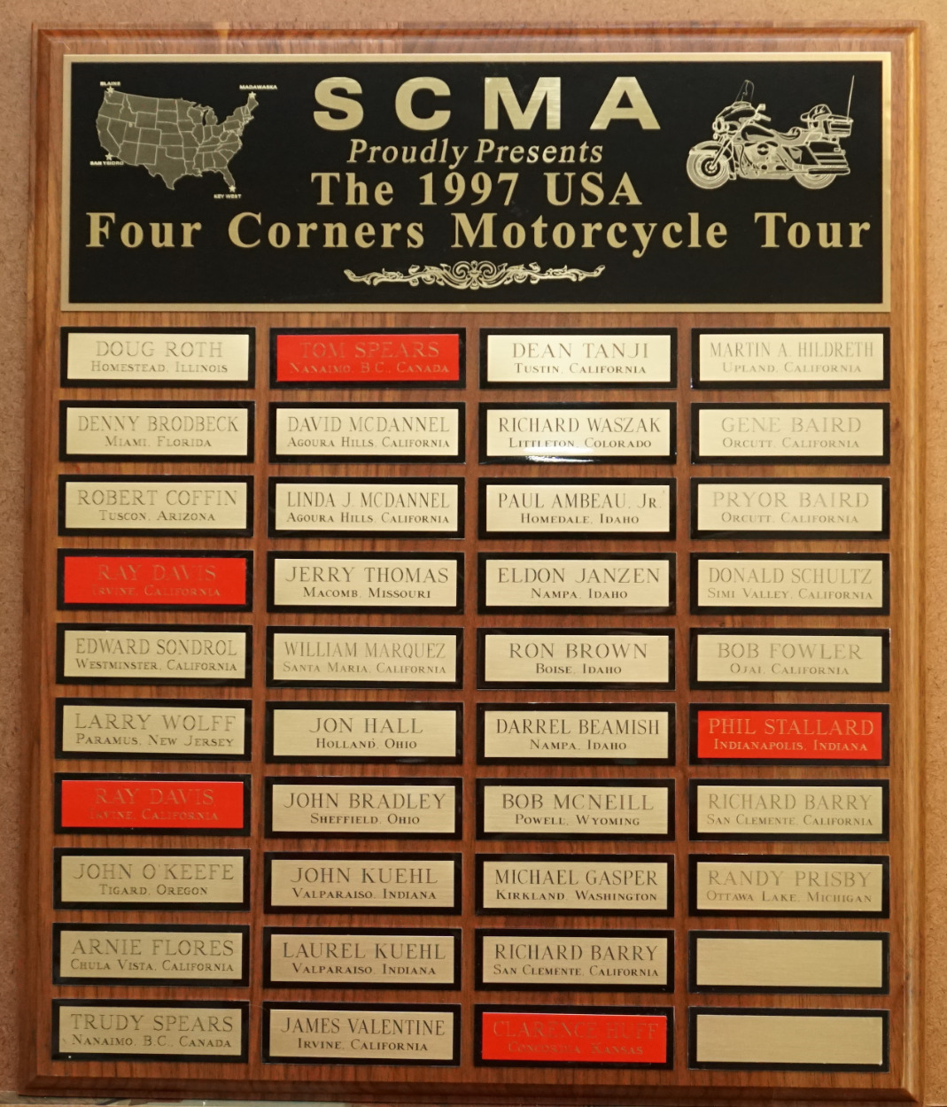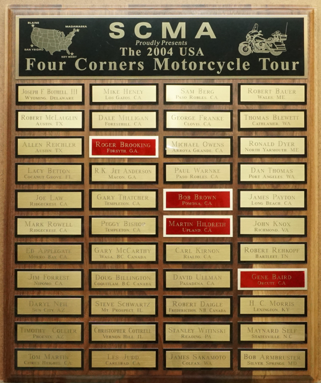 The USA Four Corners ride started officially in 1984. In the early years, the name and home town of each Four Corners Finisher was engraved on metal plates and affixed to these large walnut plaques. These plaques were created for finishers from 1984 with a few before 1984, through 2007. All of the Four Corners finishers from 1984 to the prior year are listed on the Finishers and Awards page. The red plates indicate the rider had finished the Four Corners before. These plaques were brought to and displayed at the annual Four Corners Banquet that became the Finishers Banquet in later years. That is a remarkable feat in later years since each plaque weighs about six pounds. These have been photographed a few different ways to share the look of the flashy and highly reflective surfaces as well as in a darker mode allowing you to read the names. These have been in storage for years, and we are thrilled to be able to share them here.