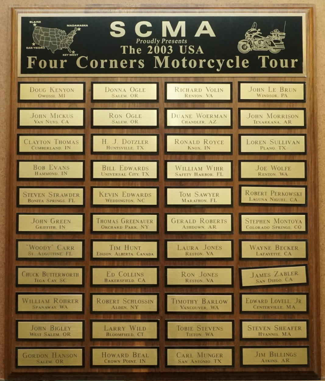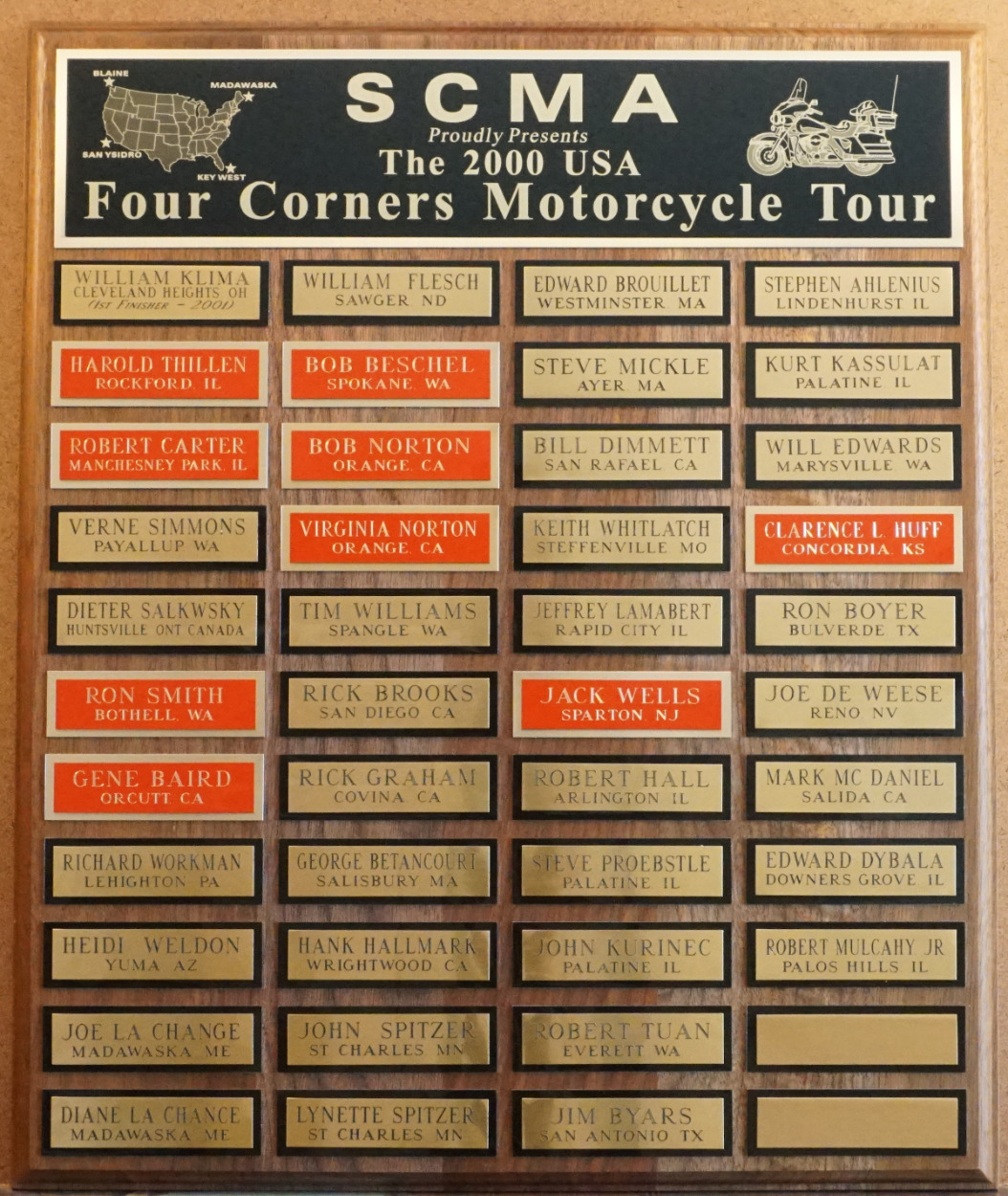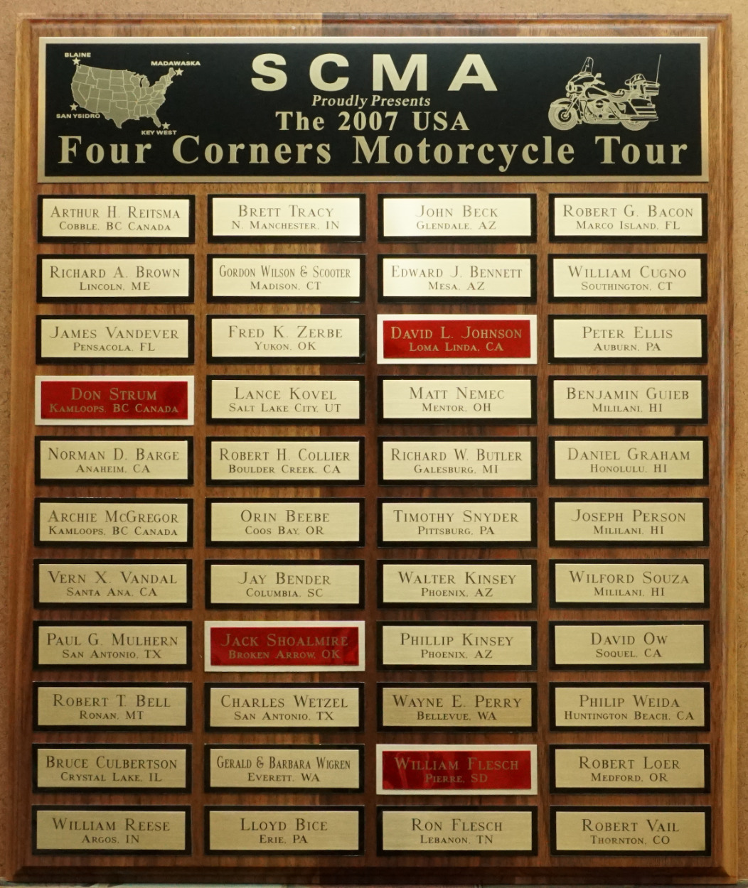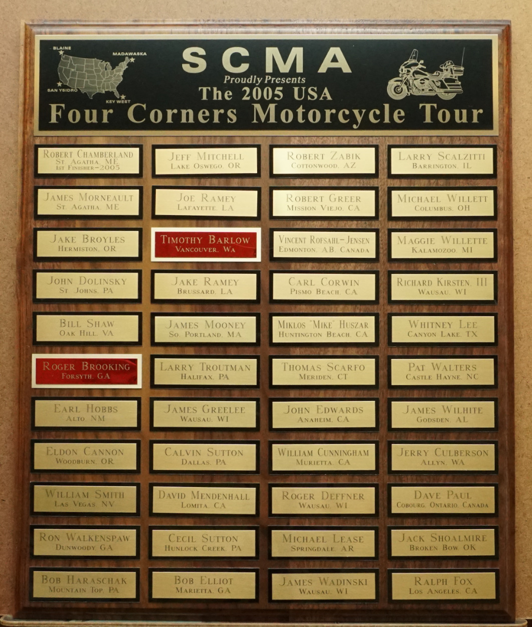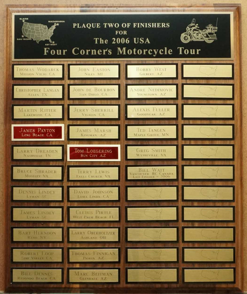 The USA Four Corners ride started officially in 1984. In the early years, the name and home town of each Four Corners Finisher was engraved on metal plates and affixed to these large walnut plaques. These plaques were created for finishers from 1984 with a few before 1984, through 2007. All of the Four Corners finishers from 1984 to the prior year are listed on the Finishers and Awards page. The red plates indicate the rider had finished the Four Corners before. These plaques were brought to and displayed at the annual Four Corners Banquet that became the Finishers Banquet in later years. That is a remarkable feat in later years since each plaque weighs about six pounds. These have been photographed a few different ways to share the look of the flashy and highly reflective surfaces as well as in a darker mode allowing you to read the names. These have been in storage for years, and we are thrilled to be able to share them here.