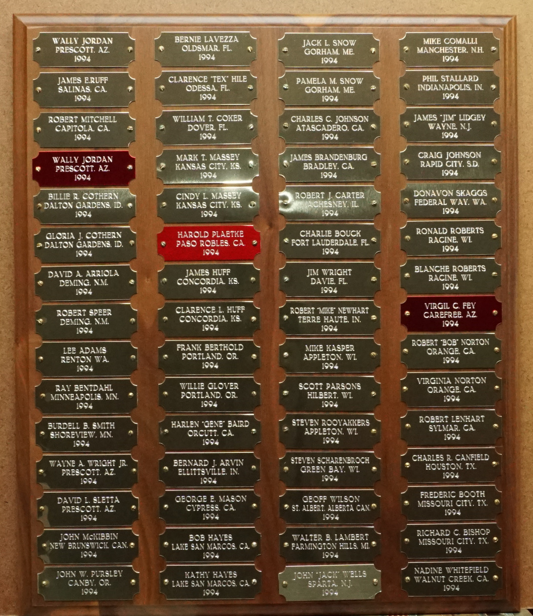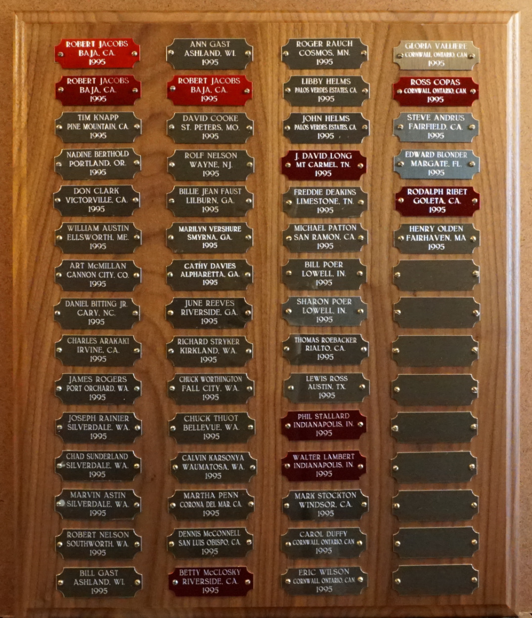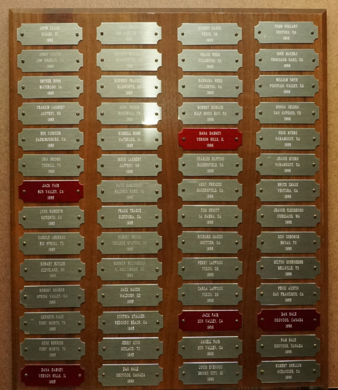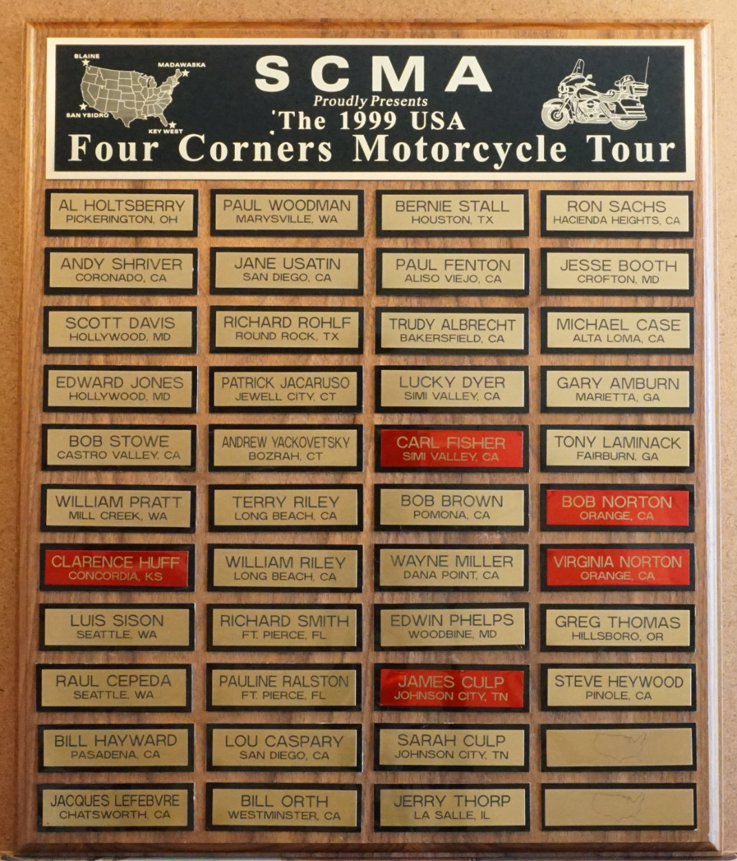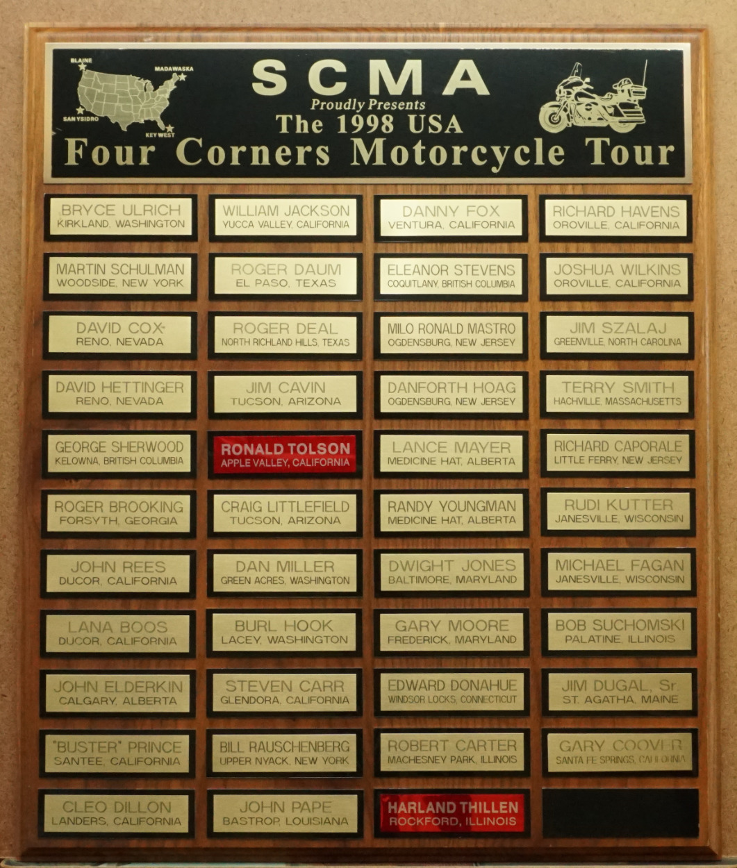 The USA Four Corners ride started officially in 1984. In the early years, the name and home town of each Four Corners Finisher was engraved on metal plates and affixed to these large walnut plaques. These plaques were created for finishers from 1984 with a few before 1984, through 2007. All of the Four Corners finishers from 1984 to the prior year are listed on the Finishers and Awards page. The red plates indicate the rider had finished the Four Corners before. These plaques were brought to and displayed at the annual Four Corners Banquet that became the Finishers Banquet in later years. That is a remarkable feat in later years since each plaque weighs about six pounds. These have been photographed a few different ways to share the look of the flashy and highly reflective surfaces as well as in a darker mode allowing you to read the names. These have been in storage for years, and we are thrilled to be able to share them here.