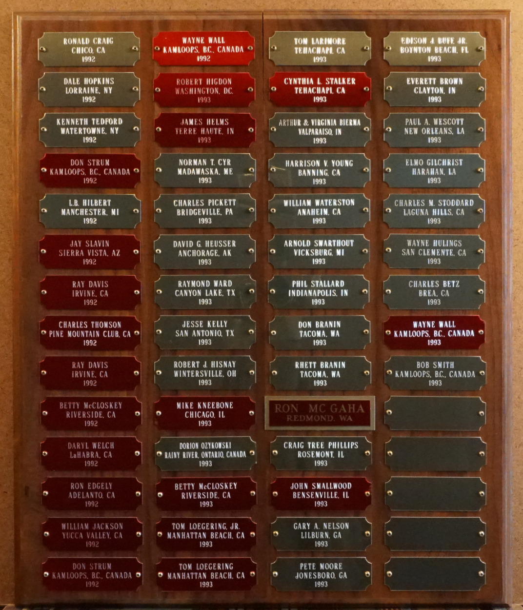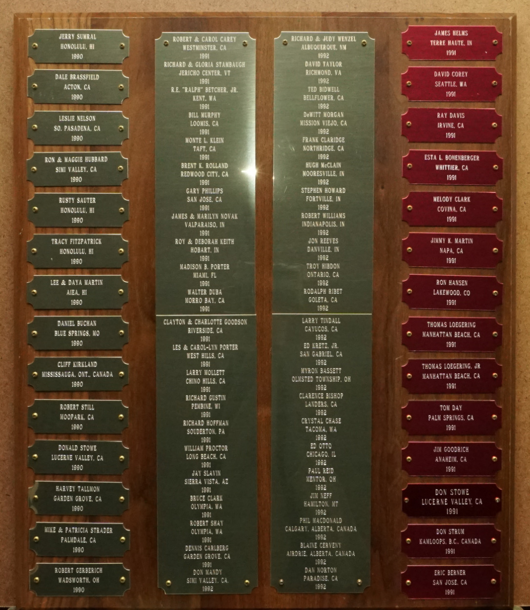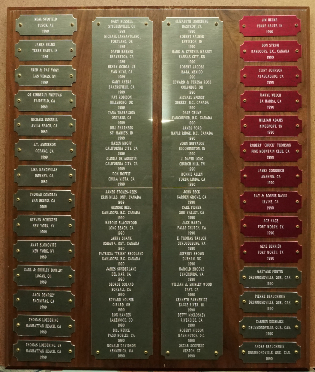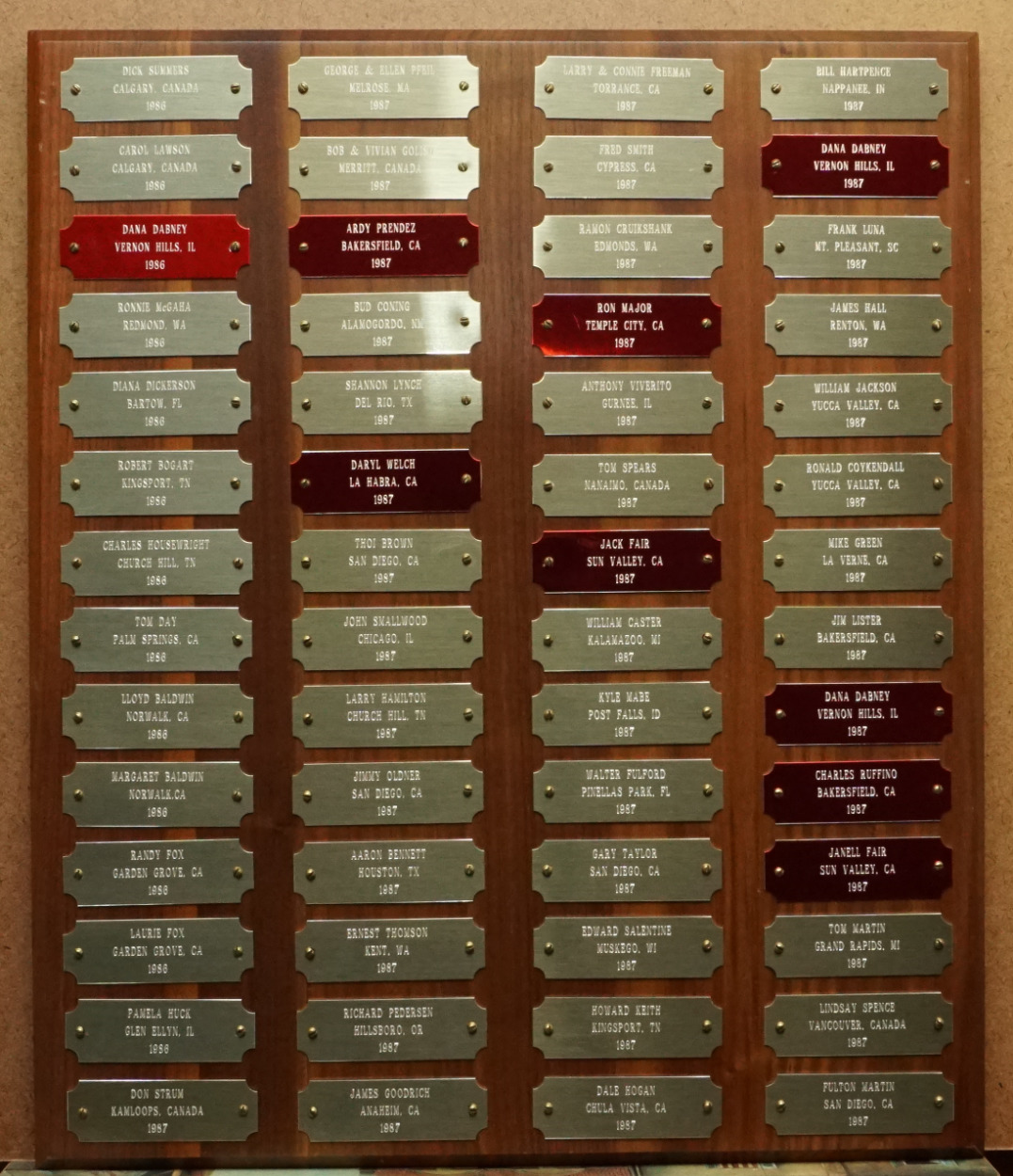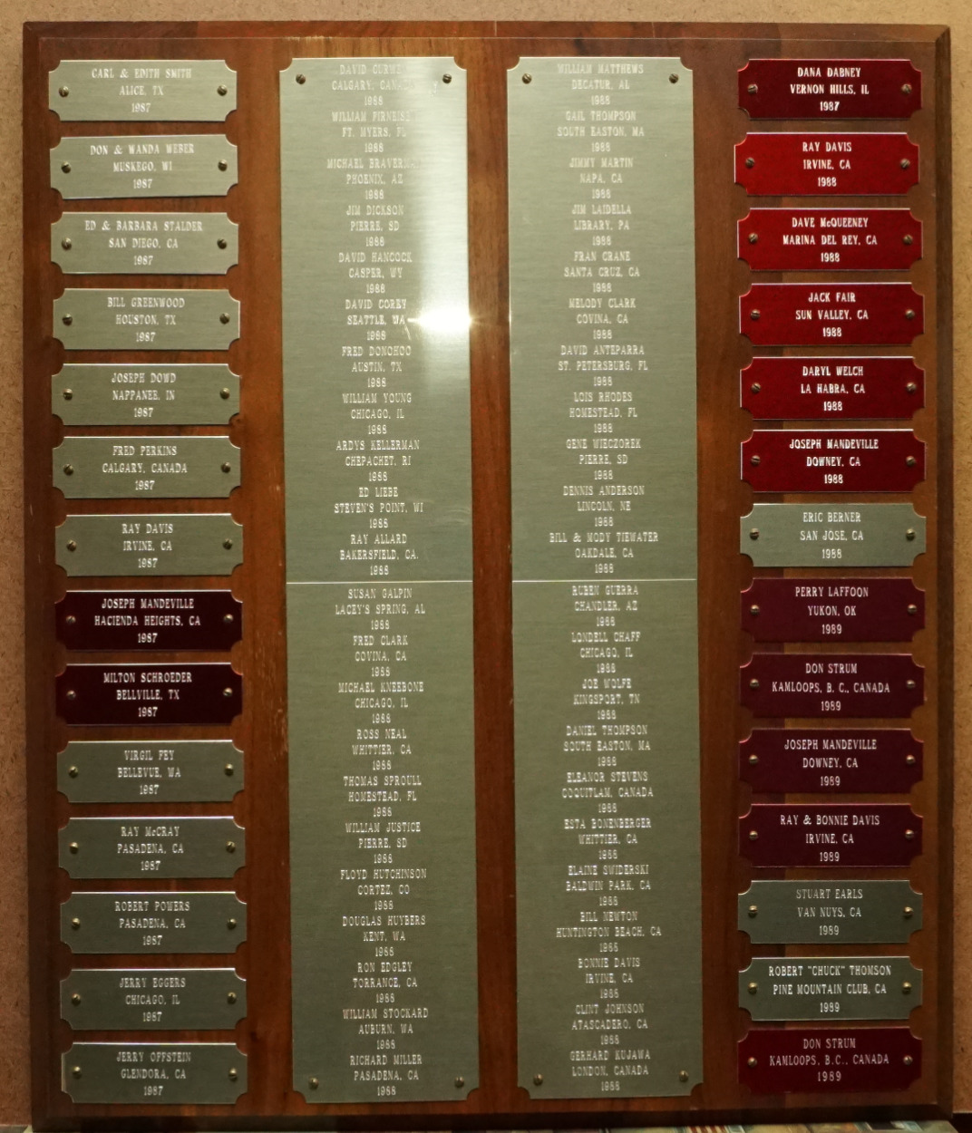 The USA Four Corners ride started officially in 1984. In the early years, the name and home town of each Four Corners Finisher was engraved on metal plates and affixed to these large walnut plaques. These plaques were created for finishers from 1984 with a few before 1984, through 2007. All of the Four Corners finishers from 1984 to the prior year are listed on the Finishers and Awards page. The red plates indicate the rider had finished the Four Corners before. These plaques were brought to and displayed at the annual Four Corners Banquet that became the Finishers Banquet in later years. That is a remarkable feat in later years since each plaque weighs about six pounds. These have been photographed a few different ways to share the look of the flashy and highly reflective surfaces as well as in a darker mode allowing you to read the names. These have been in storage for years, and we are thrilled to be able to share them here.